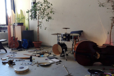 Ein Haufen Trommeln und eine zerstörte Gitarre.